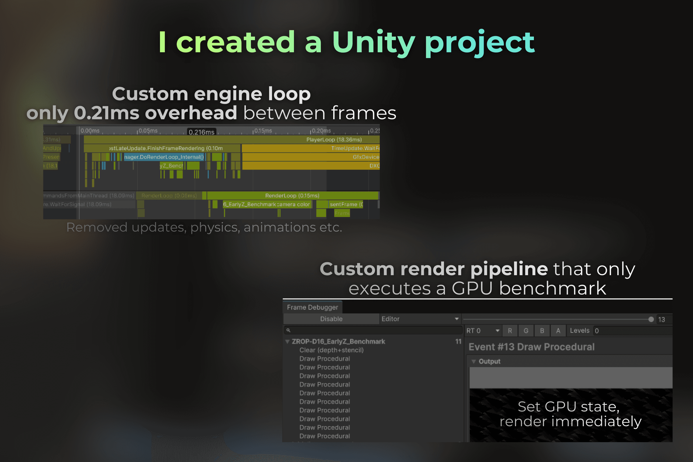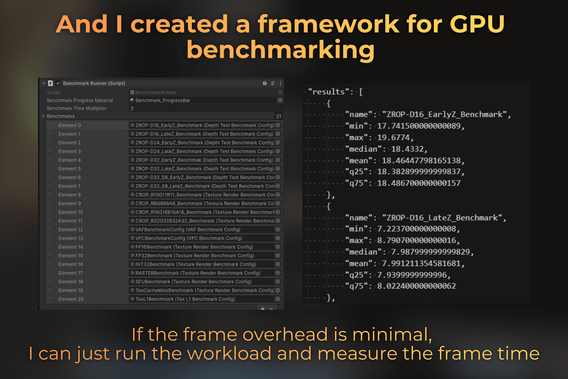 Benchmarks were done on Windows 10, Unity release build with DX12 and IL2CPP:Master.
