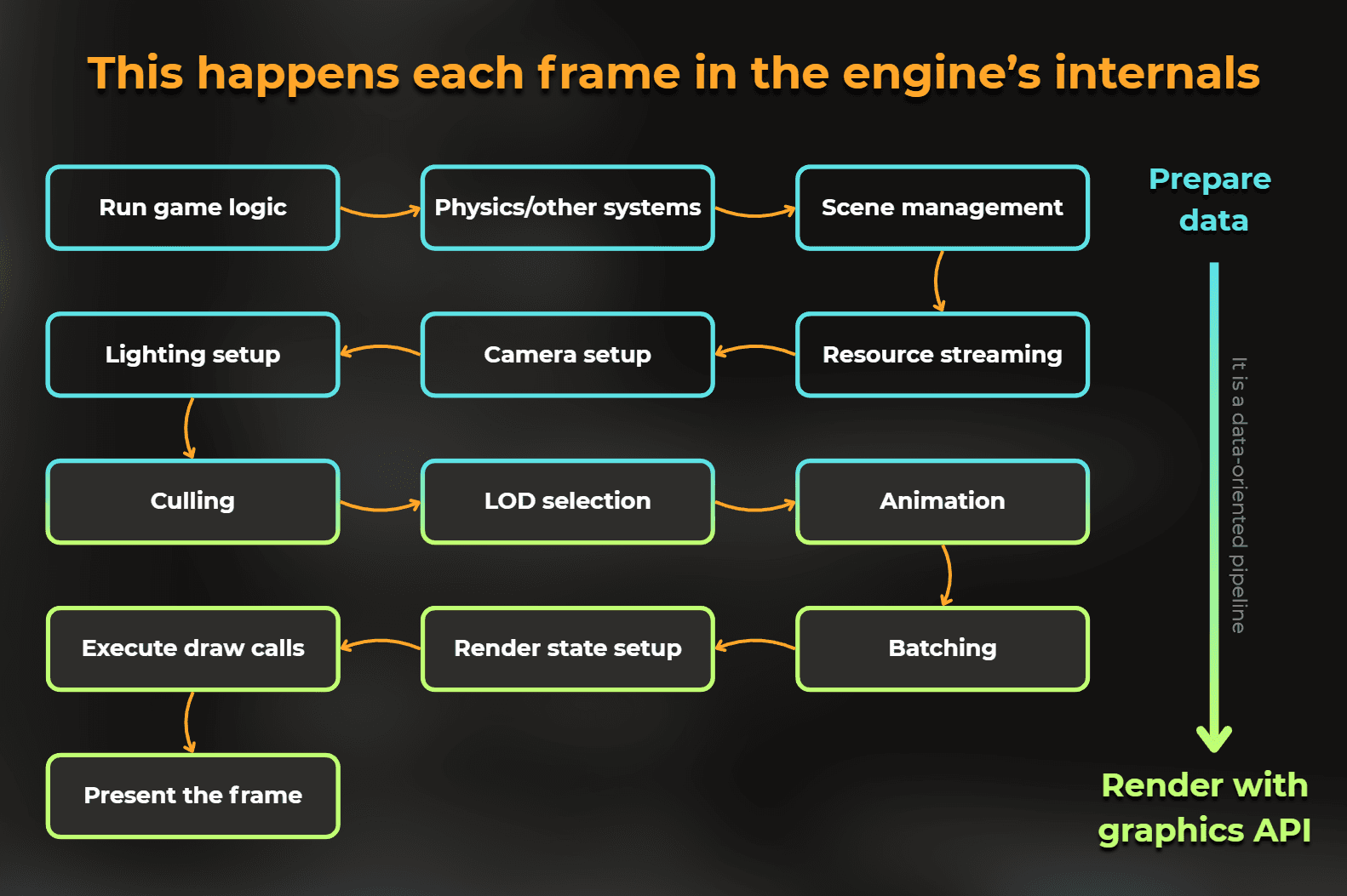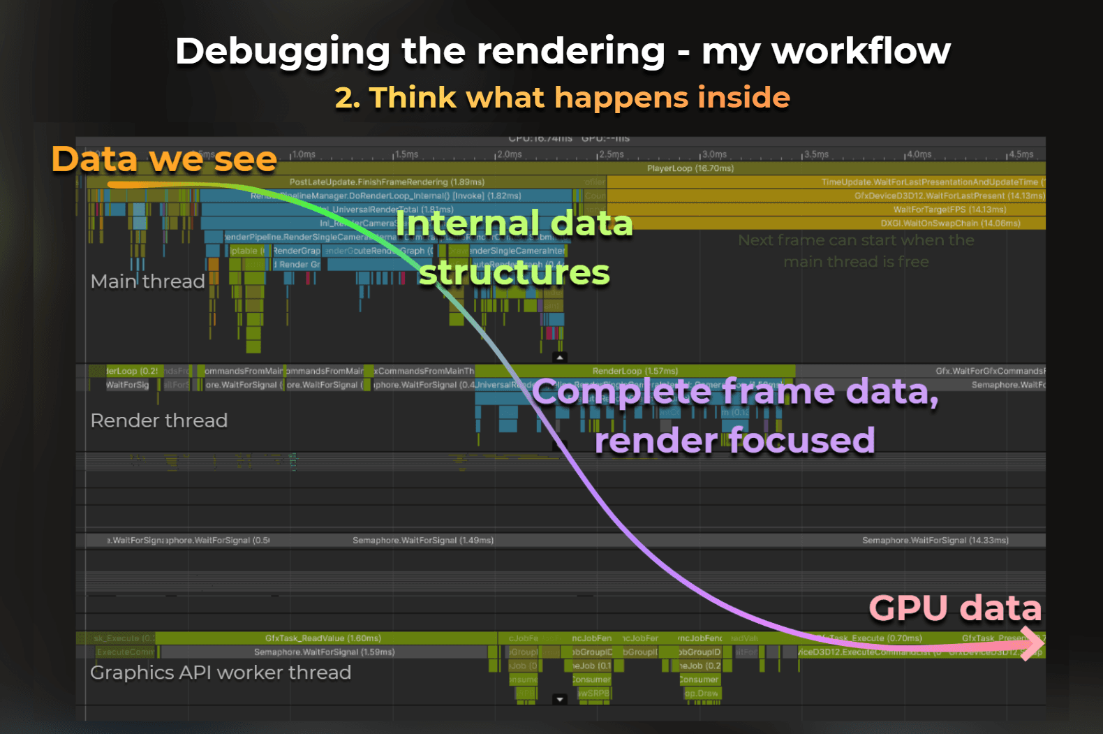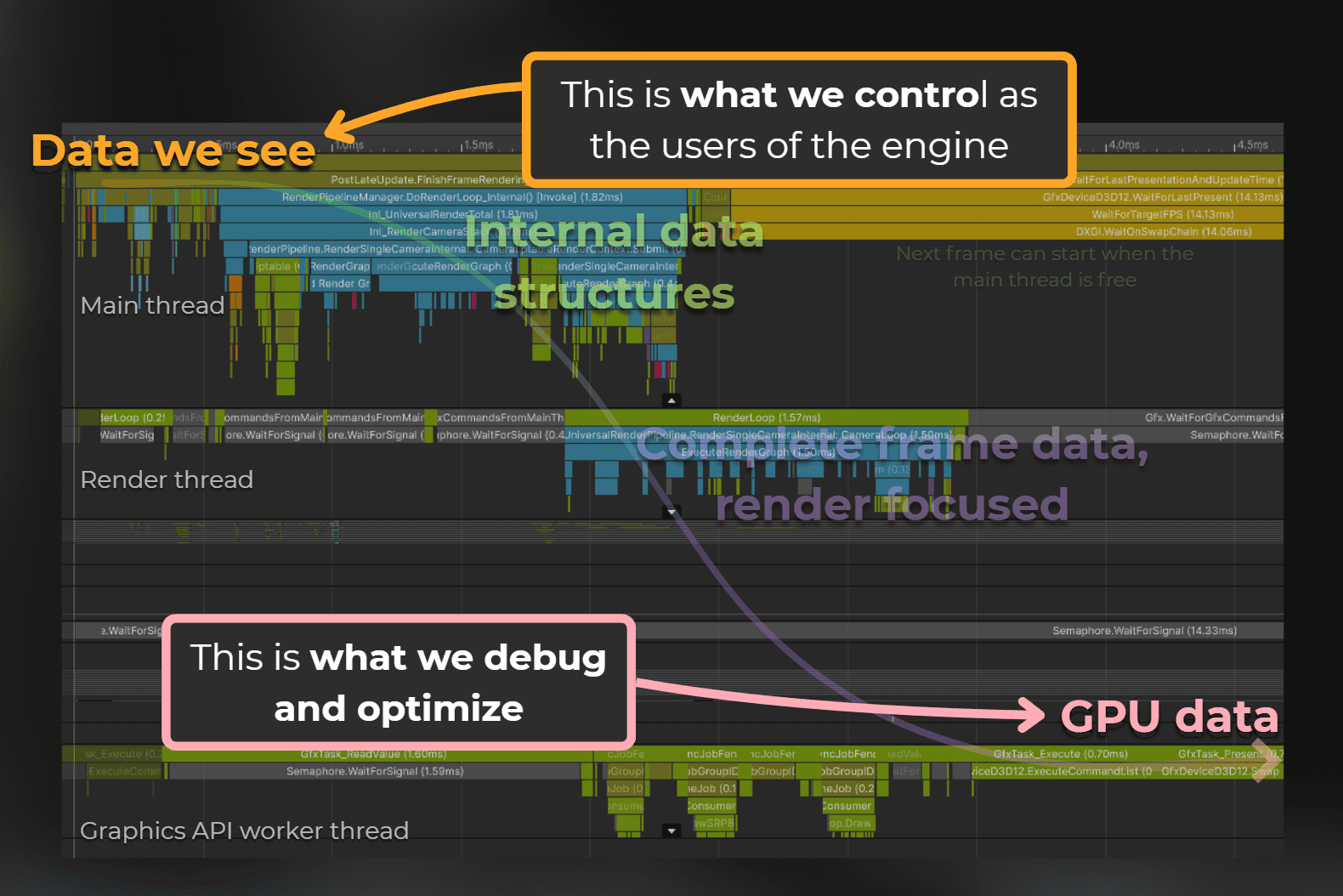 Notice the data flow. The frame starts with what we see in the project. But it quickly jumps into engine internals, being processed by the culling, preparing passes, lights. Then the frame data is passed to another thread - render thread - for communication with the GPU.
