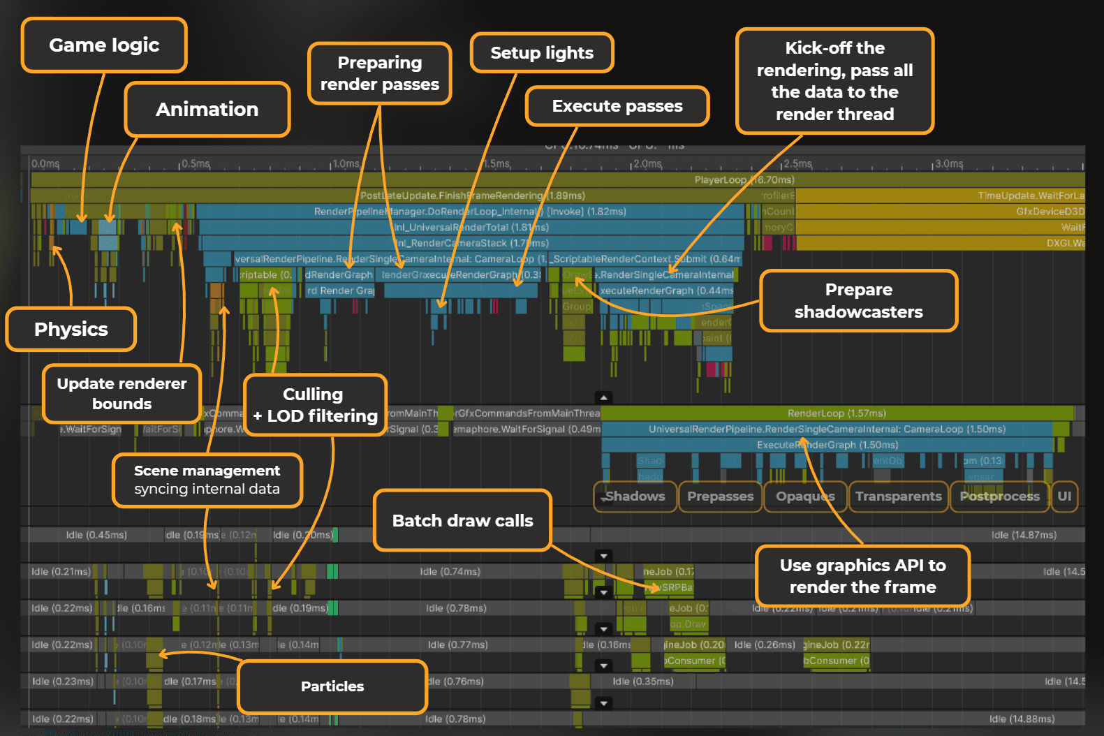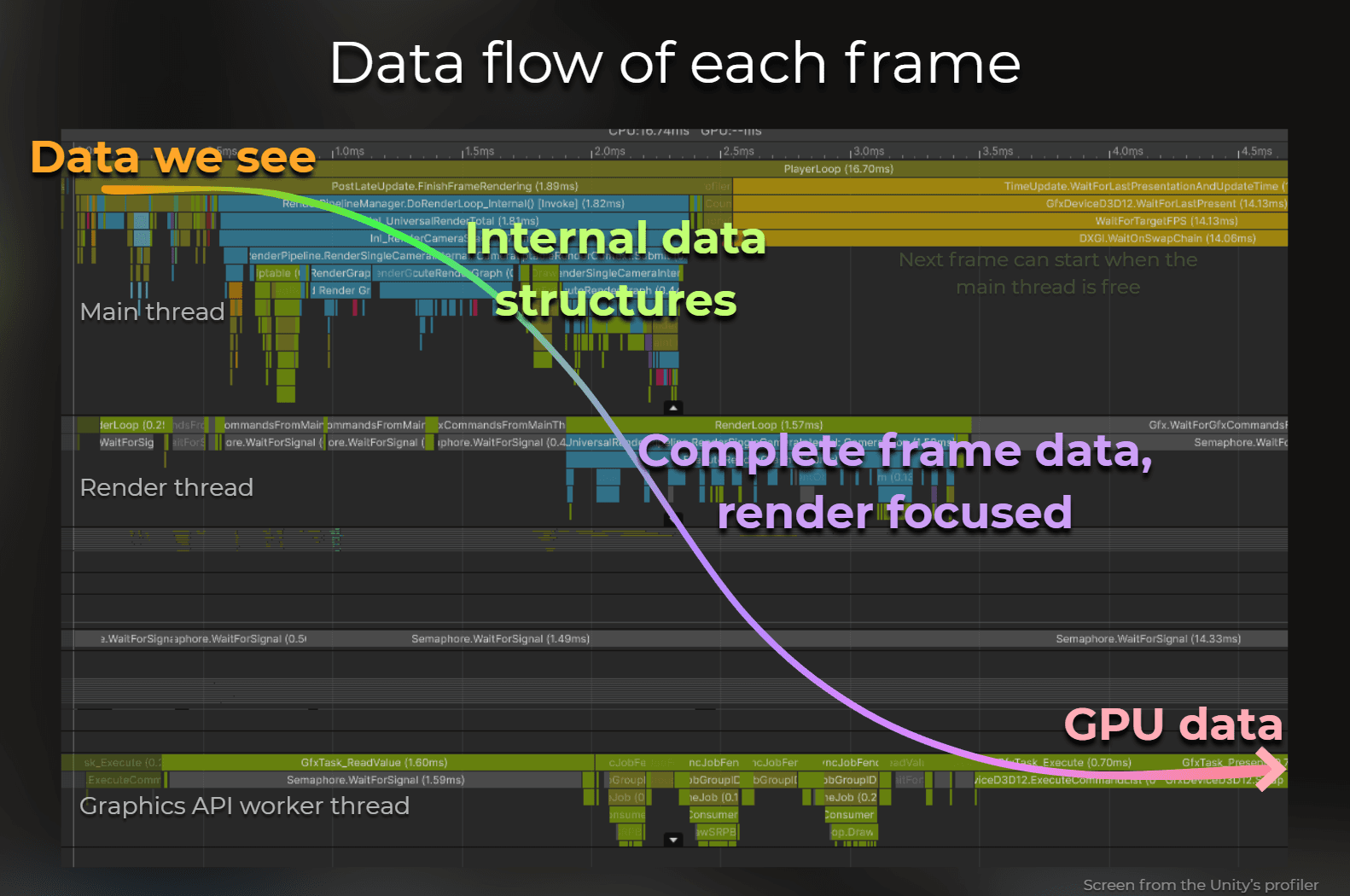 Ok, this was a high-level layout of the engine internals. It is important to understand when this happens and how. This is an example of one of the frames I captured with Unity’s profiler: