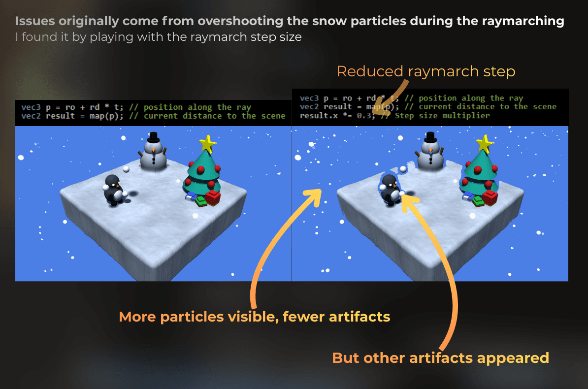 Here I will create a new particle system from scratch that avoids the issues. I will decouple particles from raymarching and use non-raymarching technique to avoid artifacts.