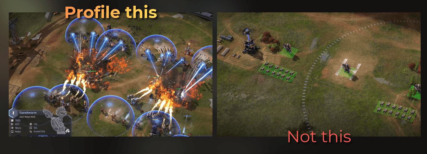 When profiling, Bob just played the game naturally. In the second profiling session, his camera pointed in a slightly different direction, so it captured far fewer heavy-to-render objects in the frustum.