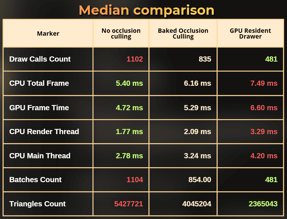 Notice that, while the GPU Resident Drawer was able to greatly reduce the draw call count and triangle count, it is the slowest solution out of all.
