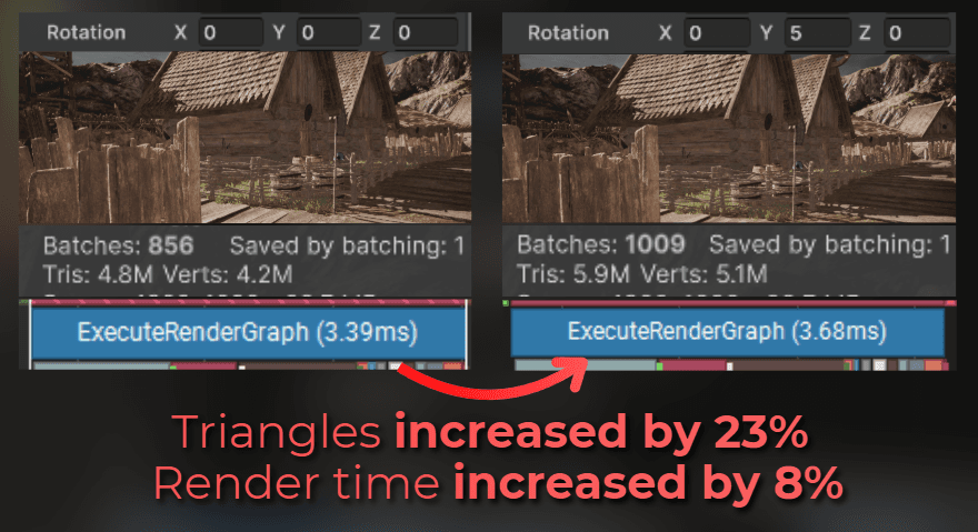 Look at this example. I changed the camera rotation by 5 degrees, and the number of rendered triangles increased, along with the render time.