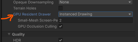 And I enabled the GPU resident drawer in the render pipeline settings here: