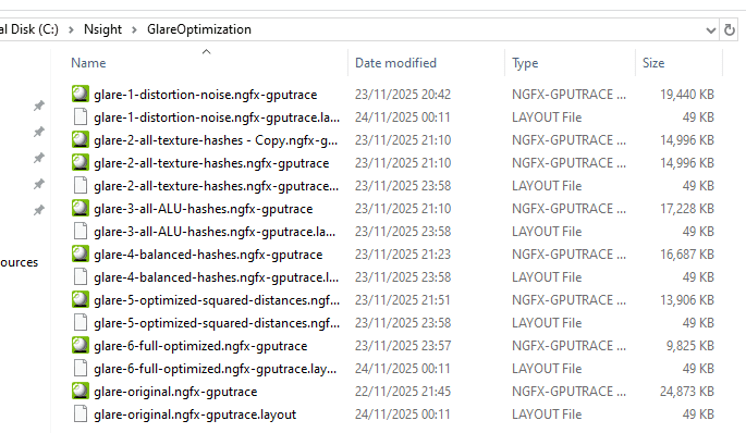 I also save all the profiling data during a single optimization session, because I could compare every single change with the other one. Look at the image above, it contains GPU profiler snapshots from the original project, and 6 optimization steps.