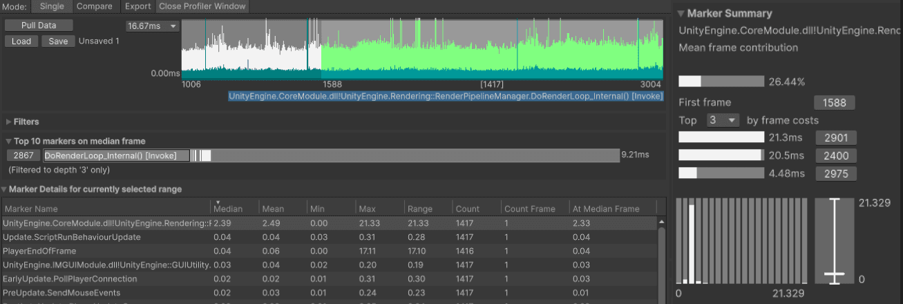 I chose the performance markers below. It is a good summary of the GPU and CPU, and it should be enough to decide which occlusion option is better. However later you will see, that GPU measurement in Unity is not precise here.