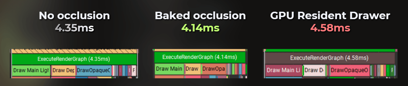 Run benchmark in three scenarios: without occlusion culling, with baked occlusion culling, with GPU resident drawer