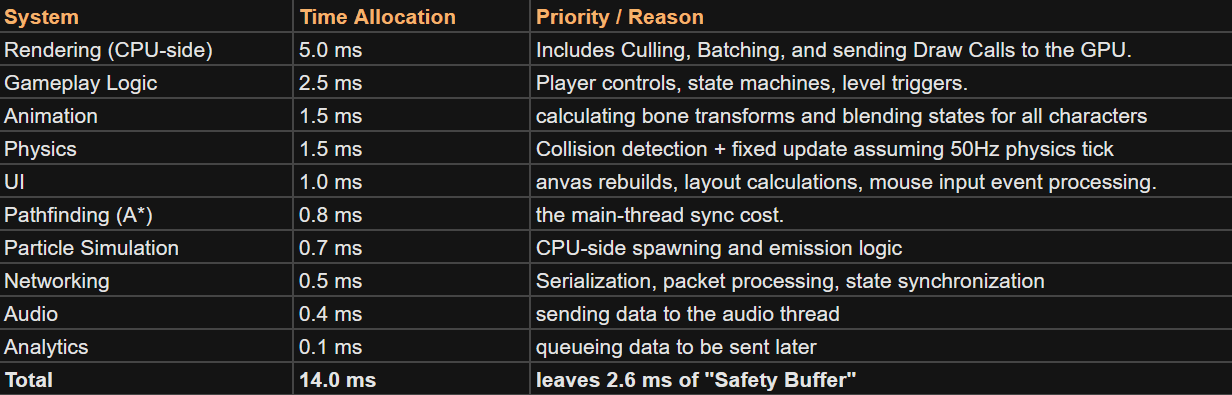 When I start to make a game, I like to think about how much of the frame budget I want to give to each of those systems. Example budgets: