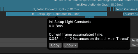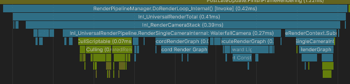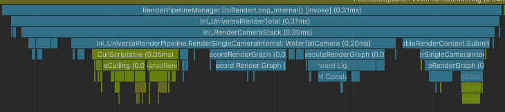 Notice that I render depth-only, and Unity will still process the lights, shadows, etc. With the Render Graph API, Unity needs to evaluate all this data to figure out if some of it can be culled during rendering. While all those steps are quick, they add up to a significant time.