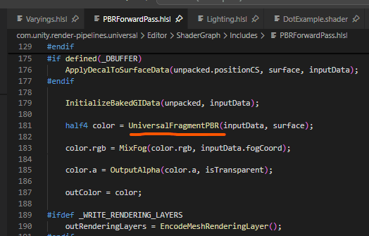 Shader Graph's master node uses the Editor\ShaderGraph\Includes\PBRForwardPass.hlsl file to generate the shader code. This code implements the lighting for the graph in forward shading. Notice that this graph always uses the PBR lighting model: