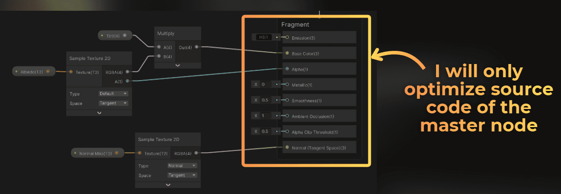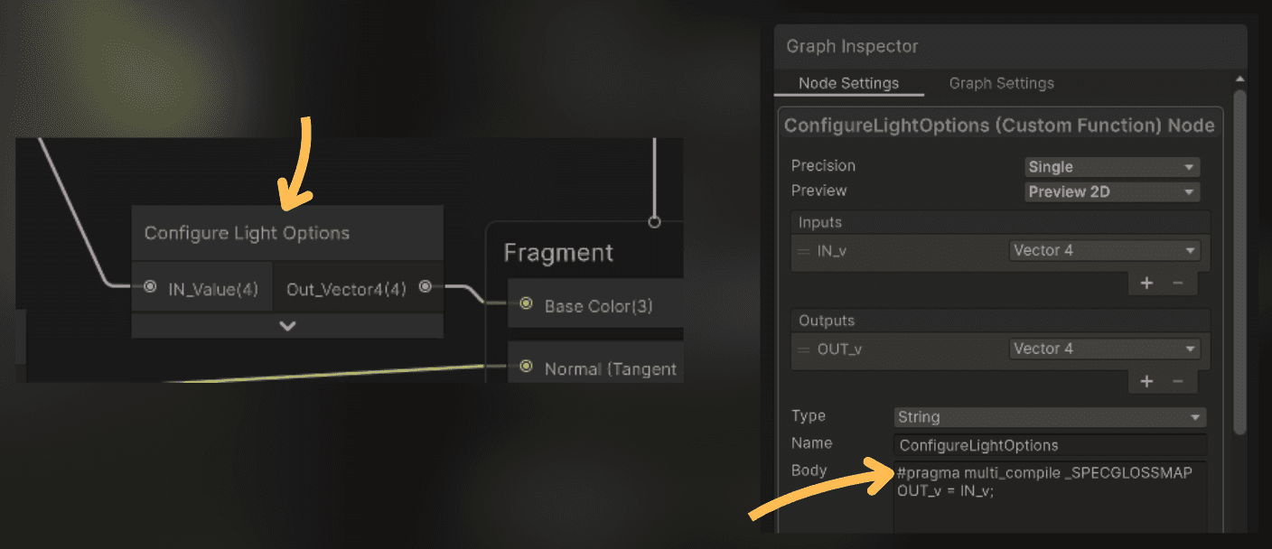 So I need to make my shaders use this keyword for compilation. Using #pragma multi_compile _SPECGLOSSMAP in a custom function node will add the specular feature to this shader without increasing the shader variant count. I just need to ensure that it is not stripped out from the shader code, so I connected this node to the base color output of the master node.