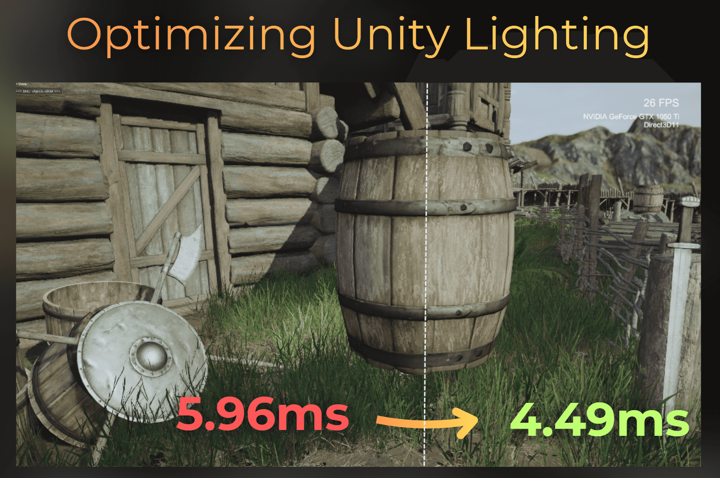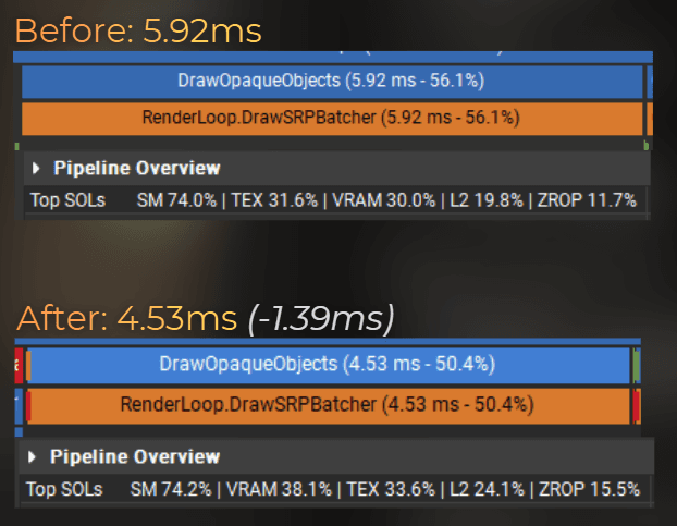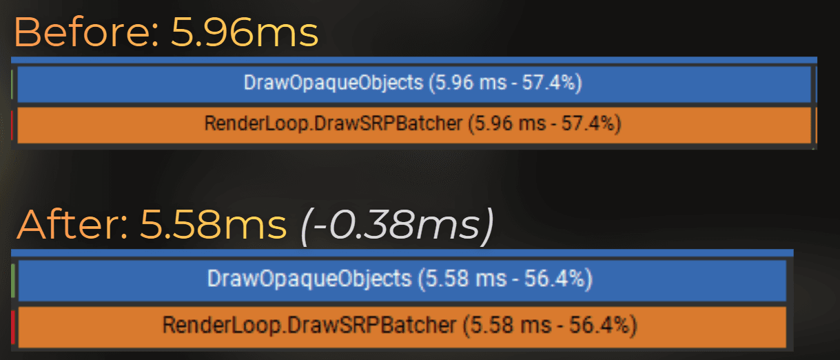 Let's check the performance of the simplified lighting. After these changes, opaque objects render 0.38 ms faster.
