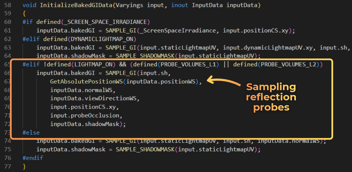Ambient lighting is computed in the InitializeBakedGIData method in PBRForwardPass.hlsl. In this project, static objects use baked lightmaps and dynamic objects use reflection probe sampling. Ambient lighting is then stored in inputData.bakedGI and used later by the lighting model.