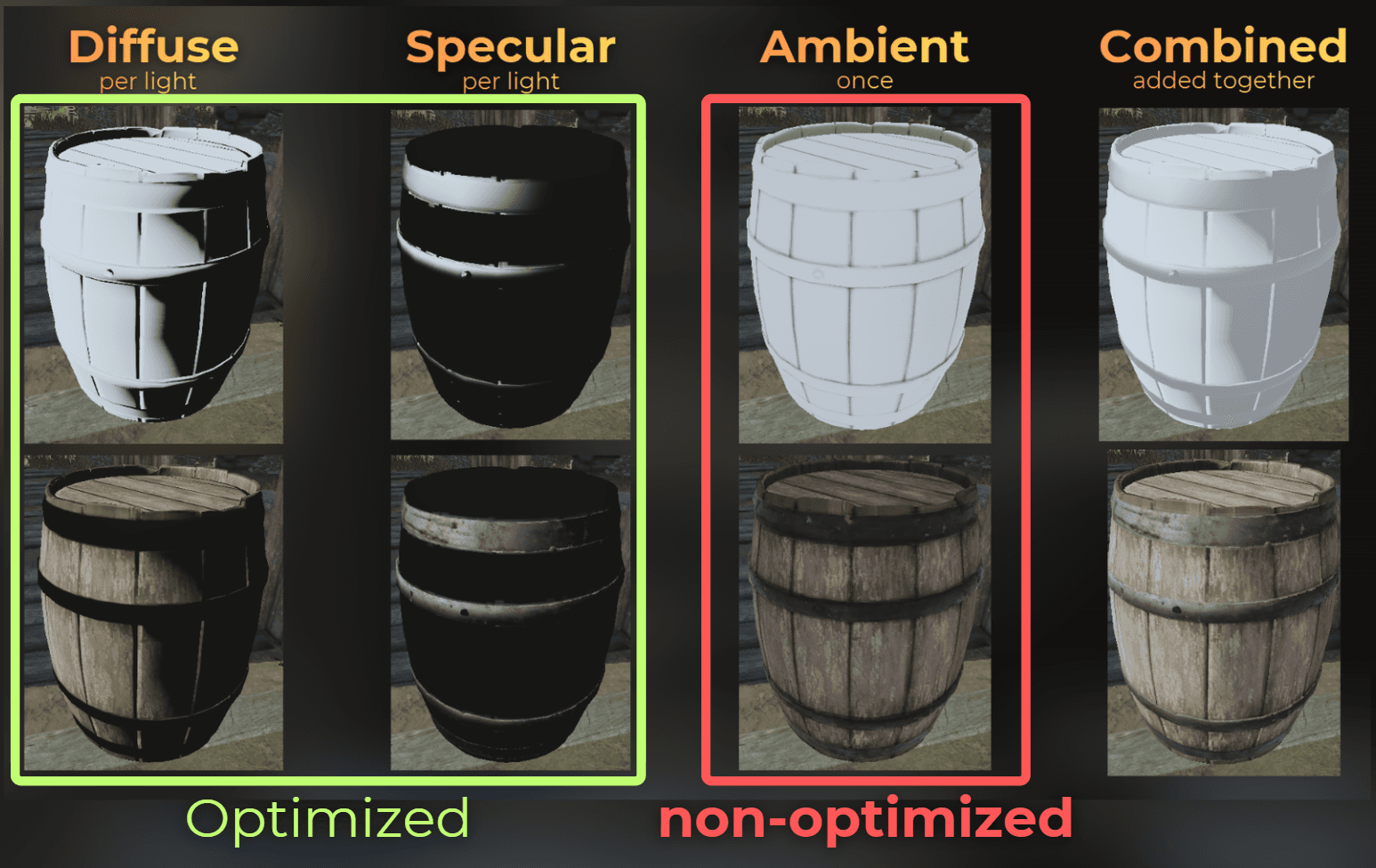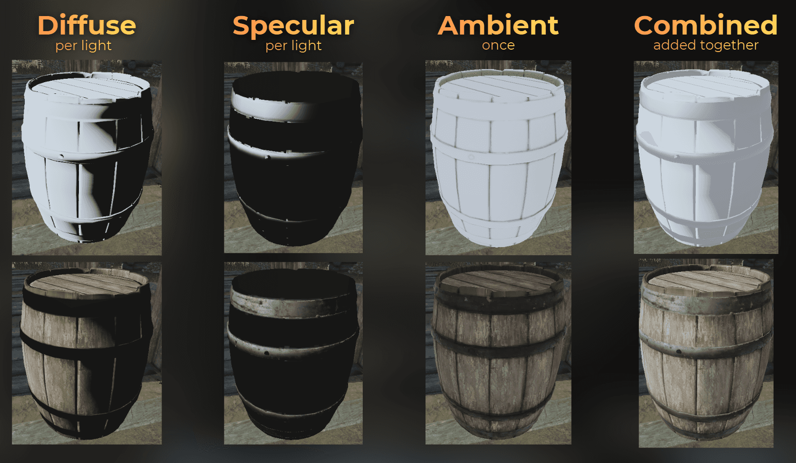 To fix that, it is good to understand how lighting works in realtime games. Lighting is computed in a few steps. For each source light, diffuse lighting and specular lighting are computed.