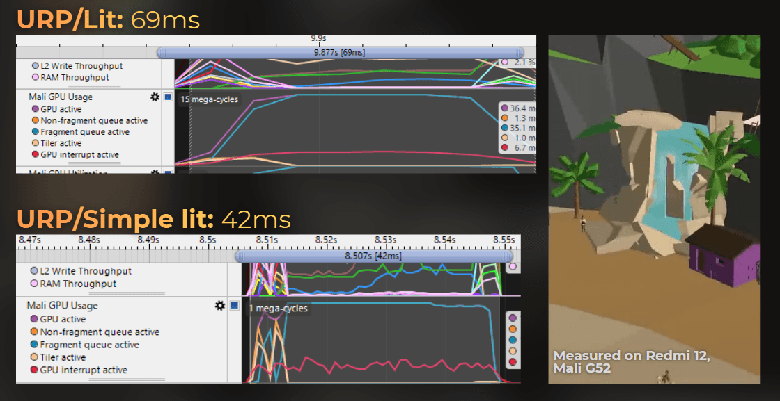 This simpler lighting model (Simple Lit) can render much faster than the PBR lighting. If I compare both of them on a mobile GPU, Simple Lit gives me 39% lower render time:
