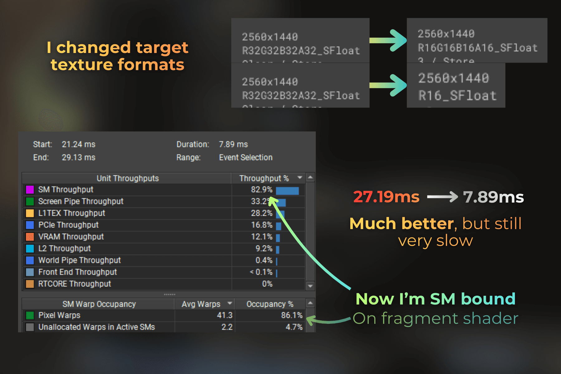 Switched render targets from 32-bit to 16-bit → 7.89ms