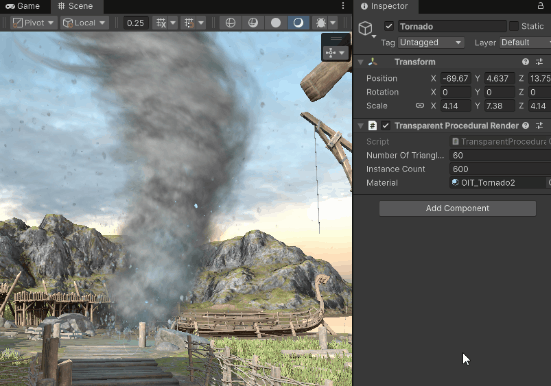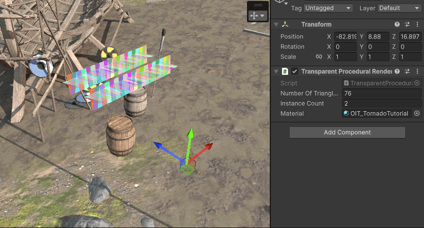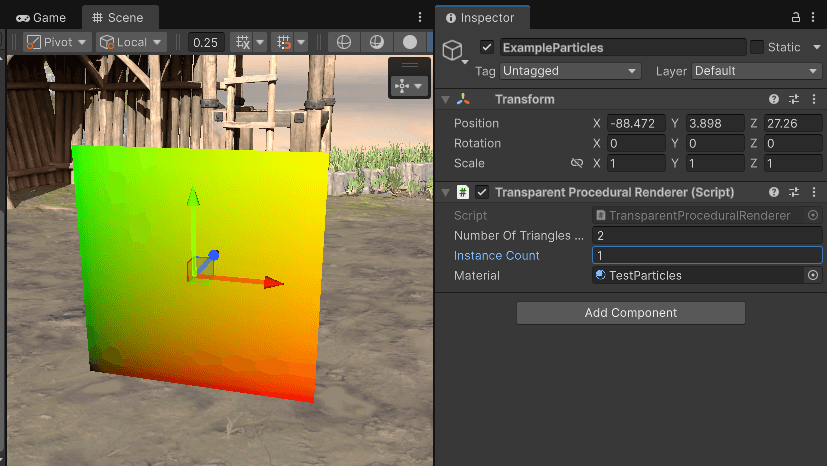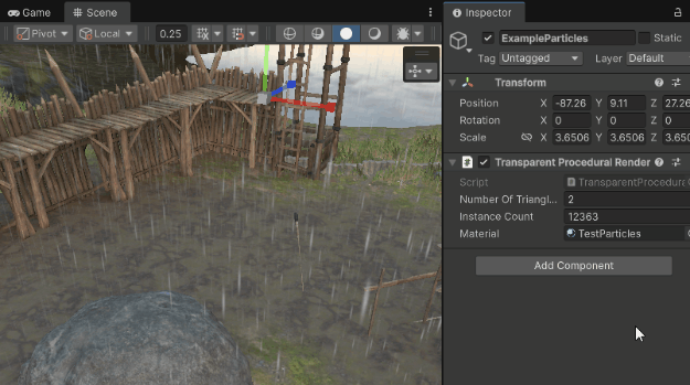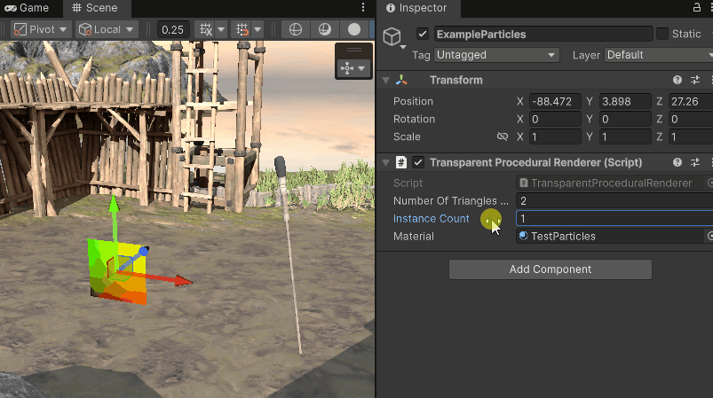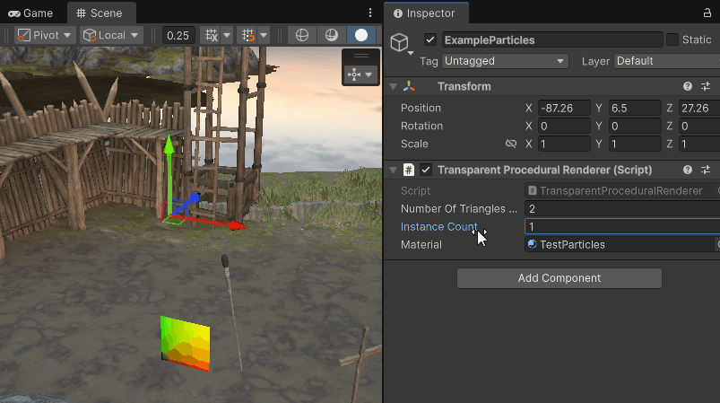 Now I'll show you how I implemented this component in Unity. It allows me to use a specific material to render a procedural mesh. I just select the number of instances and triangles, and the shader does the rest.