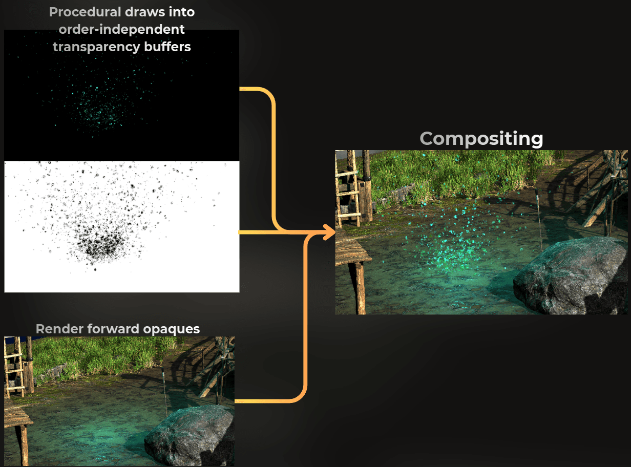 I use order-independent transparency to render the particles. This technique doesn't require sorting particles back-to-front, which is super useful for procedural particles.