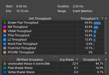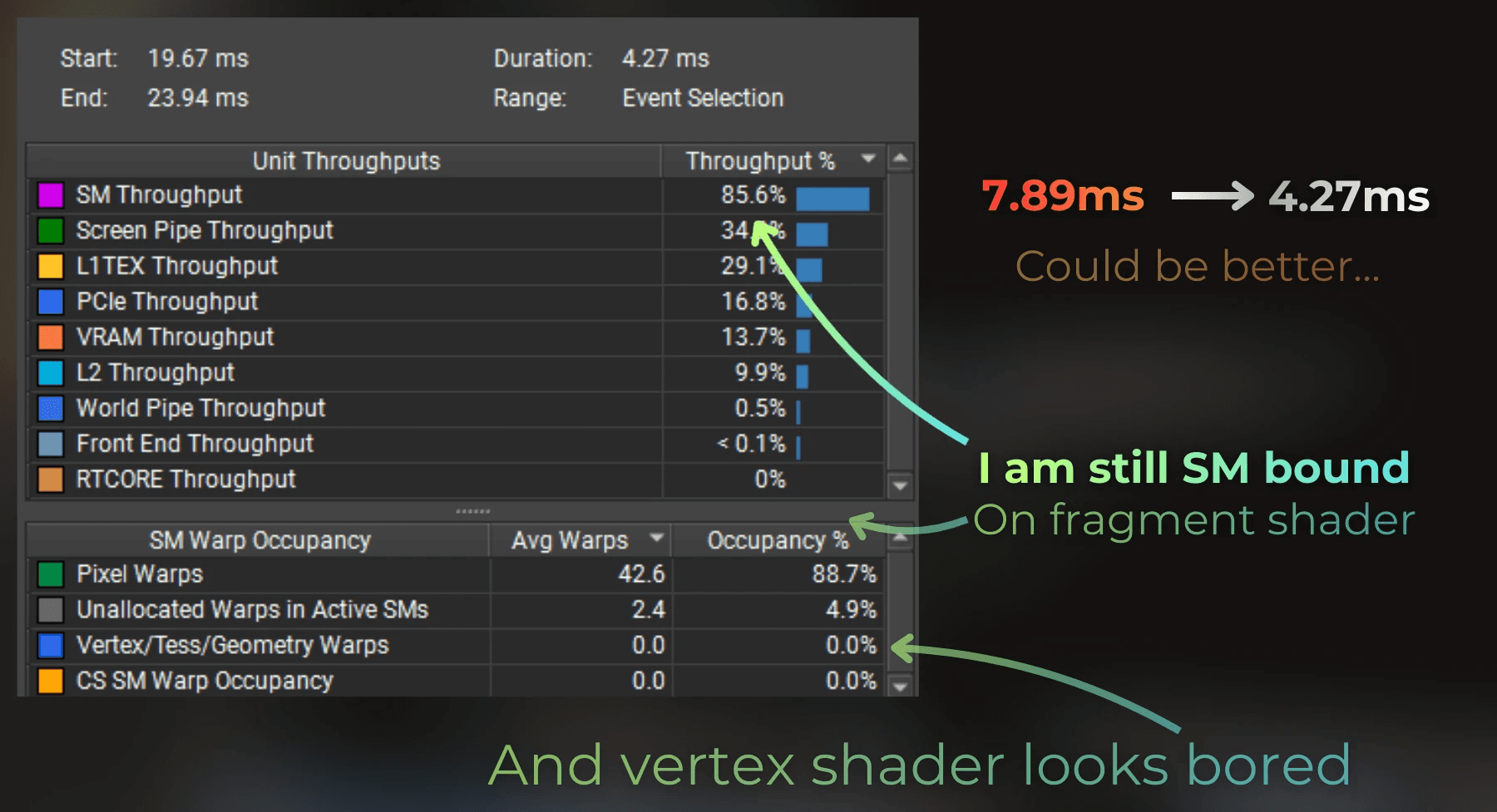 There's nothing special about the shader code, so I decided to temporarily remove the lighting from the fragment shader, and this is the result. I'm no longer SM-bound when lighting is not calculated in the shader.