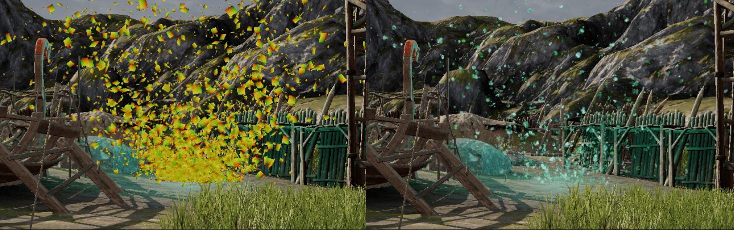 Stateless particles use instance ID + time to create animated, randomized effects without CPU mesh handling.