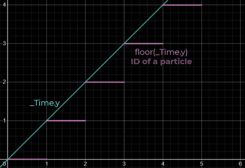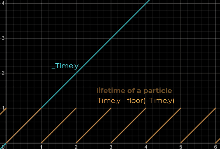To make each instance animate as a particle, I use a time property in the shader to get the lifetime of each particle and its modified ID.