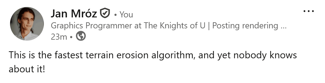 So, I studied his shaders and implemented my own version in Unity to learn more about them. Below erosion takes 100ms for a 1024x1024 heightmap on RTX 3060. It would take 1 second to process 10 KM2 of the terrain - insane efficiency.