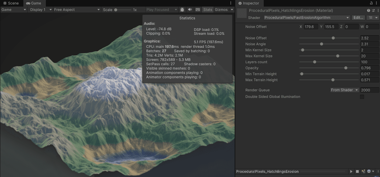 The terrain is rendered using a dense mesh. I didn't optimize anything here because I want to focus on the erosion algorithm.